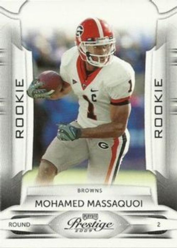 The Mohamed Massaquoi 2009 Playoff Prestige #180 Base Rookie card is 1 of 20 Mohamed Massaquoi's card variations in the 2009 Playoff Prestige set being tracked by Sports Card Investor, including Xtra Points Orange /300, Xtra Points Gold /250, Xtra Points Red /100, Xtra Points Purple /50, and Xtra Points Green /25.