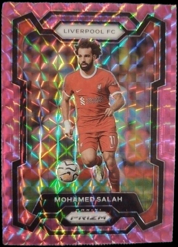 The Mohamed Salah 2023 Prizm Premier League #73 Pink Mosaic card is 1 of 62 Mohamed Salah's card variations in the 2023 Prizm Premier League set being tracked by Sports Card Investor, including Base, Blue Mosaic, Breakaway, Breakaway Orange, and Choice.