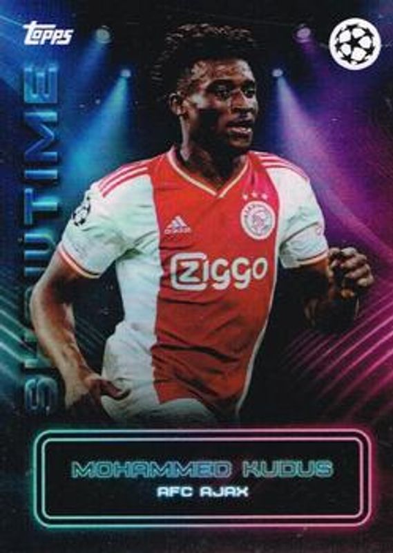 The Mohammed Kudus 2022 Topps Showtime UEFA Club Competitions Base card is 1 of 8 Mohammed Kudus' card variations in the 2022 Topps Showtime UEFA Club Competitions set being tracked by Sports Card Investor, including Green /99, Holo /75, Blue /49, Purple /25, and Red /10.