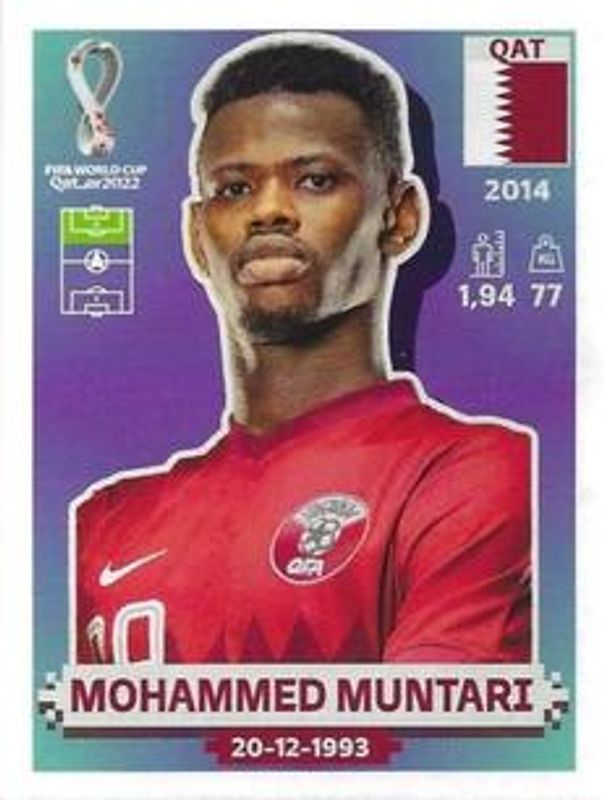 The Mohammed Muntari 2022 Panini World Cup Stickers #QAT20 Base card is 1 of 7 Mohammed Muntari's card variations in the 2022 Panini World Cup Stickers set being tracked by Sports Card Investor, including Blue (1:2), Gold, Green (1:1,445), Purple (1:205), and Red (1:26).
