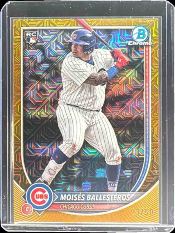 The Moises Ballesteros 2025 Bowman Chrome Mega Box #42 Gold Mojo Refractor /50 Rookie card is 1 of 11 Moises Ballesteros' card variations in the 2025 Bowman Chrome Mega Box set being tracked by Sports Card Investor, including Mojo Refractor, Aqua Mojo Refractor /299, Purple Mojo Refractor /250, Pink Mojo Refractor /199, and Blue Mojo Refractor /150.