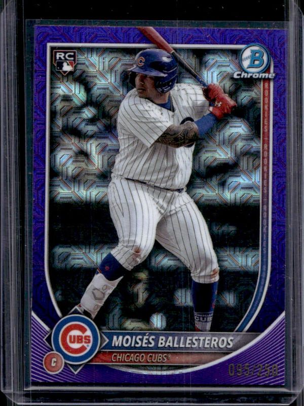 The Moises Ballesteros 2025 Bowman Chrome Mega Box #42 Purple Mojo Refractor /250 Rookie card is 1 of 11 Moises Ballesteros' card variations in the 2025 Bowman Chrome Mega Box set being tracked by Sports Card Investor, including Mojo Refractor, Aqua Mojo Refractor /299, Pink Mojo Refractor /199, Blue Mojo Refractor /150, and Green Mojo Refractor /99.