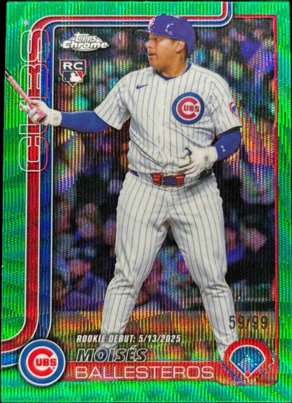 The Moises Ballesteros 2025 Topps Chrome Update #USC7 Green Wave Refractor /99 Rookie card is 1 of 137 Moises Ballesteros' card variations in the 2025 Topps Chrome Update set being tracked by Sports Card Investor, including #USC7 Base, #USC93 Base, #USC7 Geometric Refractor, #USC93 Geometric Refractor, and #USC7 Negative Refractor.