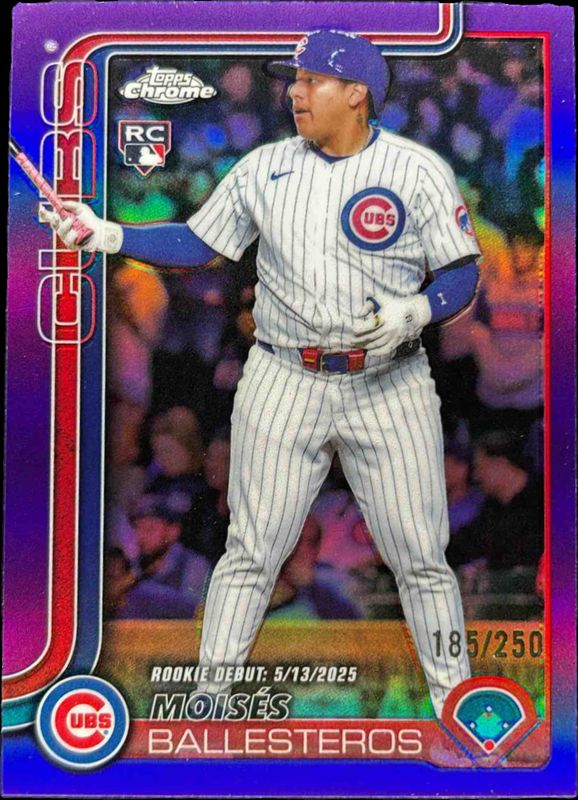 The Moises Ballesteros 2025 Topps Chrome Update #USC7 Purple Refractor /250 Rookie card is 1 of 137 Moises Ballesteros' card variations in the 2025 Topps Chrome Update set being tracked by Sports Card Investor, including #USC7 Base, #USC93 Base, #USC7 Geometric Refractor, #USC93 Geometric Refractor, and #USC7 Negative Refractor.