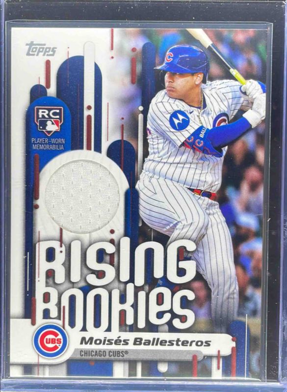 The Moises Ballesteros 2025 Topps Update #RRR-MB Rising Rookie Relics card is 1 of 161 Moises Ballesteros' card variations in the 2025 Topps Update set being tracked by Sports Card Investor, including #US262 Base, #US236 Base, #US236 Aqua Holo Foil, #US262 Aqua Holo Foil, and #US236 Aqua Rainbow Foil.