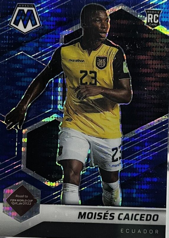 The Moises Caicedo 2021 Mosaic Road to FIFA World Cup #78 Blue Pulsar Rookie card in Raw condition has not changed in price in the last 30 days and was last sold for $6.75 .