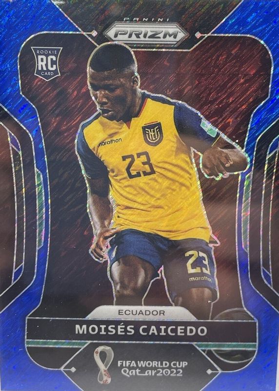 The Moises Caicedo 2022 Prizm World Cup #81 Blue Shimmer /5 Rookie card in Raw condition has not changed in price in the last 30 days and was last sold for $202.50 .
