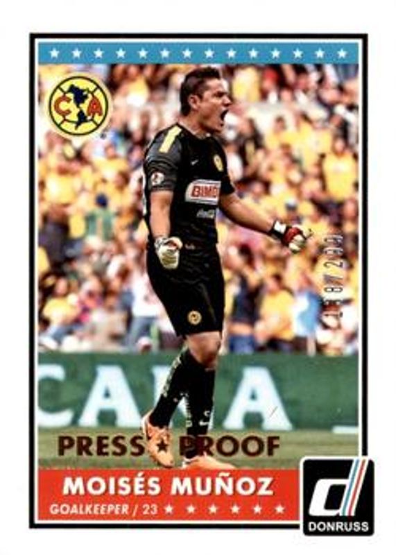 The Moises Munoz 2015 Donruss #64 Bronze Press Proof /299 card is 1 of 16 Moises Munoz's card variations in the 2015 Donruss set being tracked by Sports Card Investor, including Base, Silver Press Proof /199, Gold Press Proof /99, Red Soccer Ball /49, and Green Soccer Ball /25.