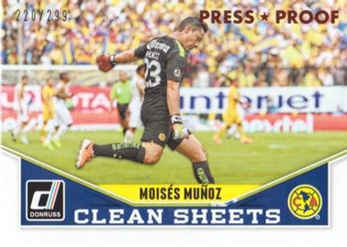 The Moises Munoz 2015 Donruss #9 Clean Sheets Bronze Press Proof /299 card is 1 of 16 Moises Munoz's card variations in the 2015 Donruss set being tracked by Sports Card Investor, including Base, Bronze Press Proof /299, Silver Press Proof /199, Gold Press Proof /99, and Red Soccer Ball /49.