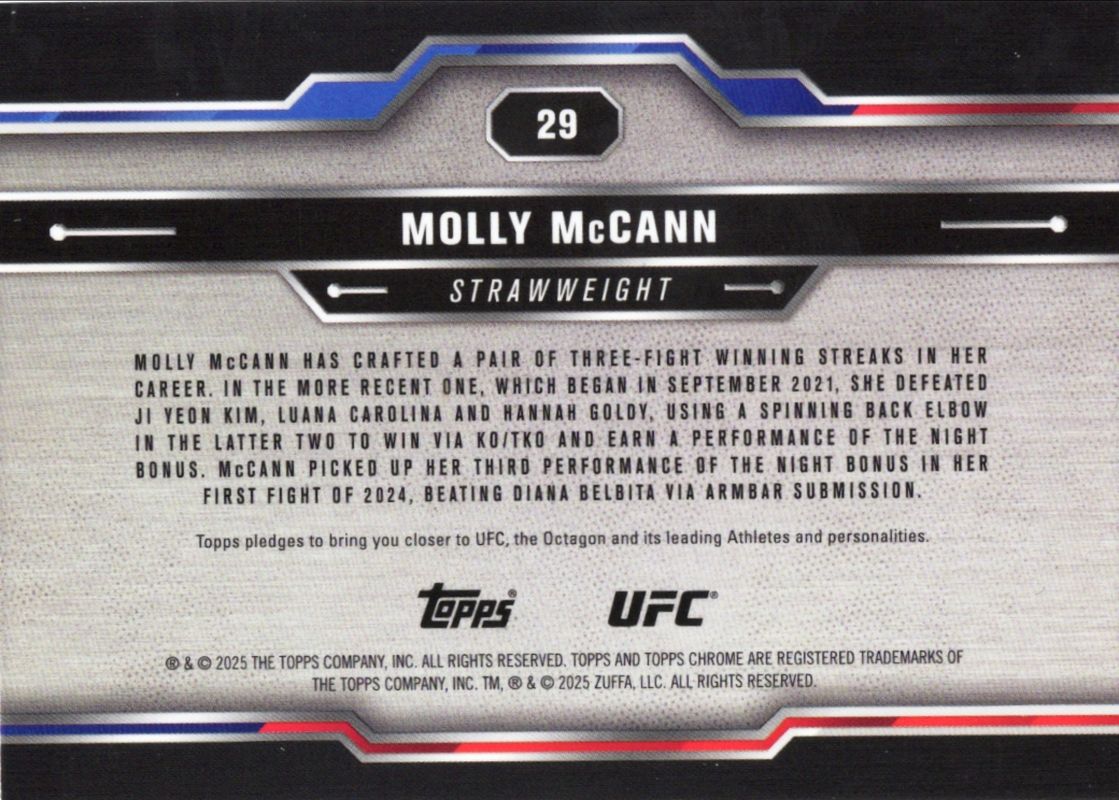 The Molly McCann 2025 Topps Chrome UFC #29 Base card is 1 of 65 Molly McCann's card variations in the 2025 Topps Chrome UFC set being tracked by Sports Card Investor, including Geometric Refractor, Negative Refractor, Prism Refractor, Purple Refractor, and Red & Blue Refractor.