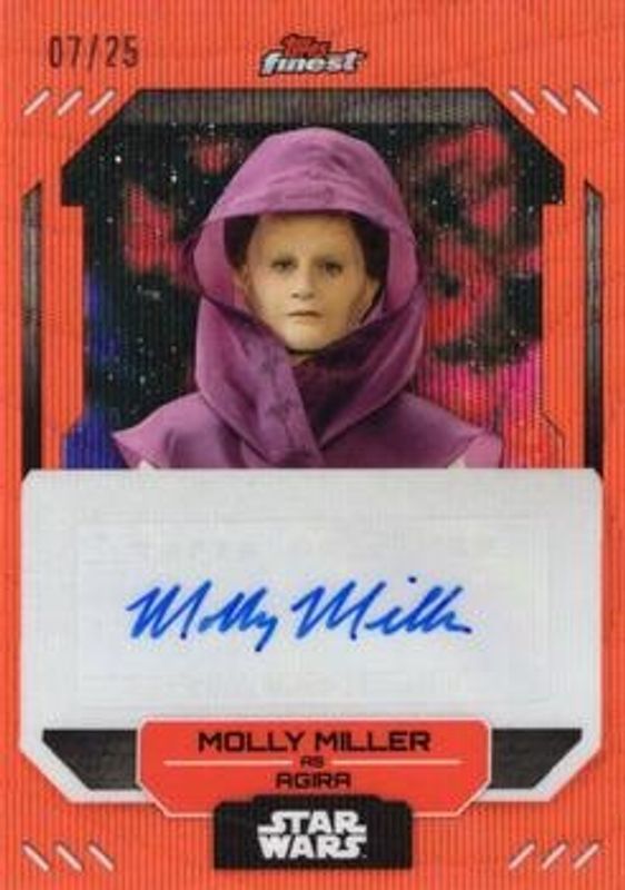 The Molly Miller 2023 Topps Finest #FA-MM Finest Autographs Orange Wave /25 card is 1 of 15 Molly Miller's card variations in the 2023 Topps Finest set being tracked by Sports Card Investor, including Finest Autographs, Finest Autographs Aqua /199, Finest Autographs Green /99, Finest Autographs Green Wave /99, and Finest Autographs Purple /75.