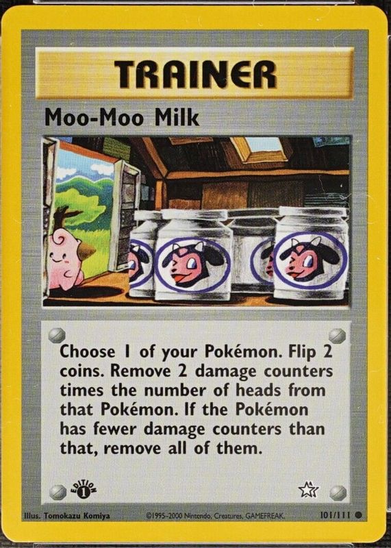 The Moo-Moo Milk 2000 Neo Genesis #101/111 1st Edition card in Raw TCG (Near Mint) condition has moved down -$2.54 (-39.1%) in the last 30 days and was last sold for $3.95 .