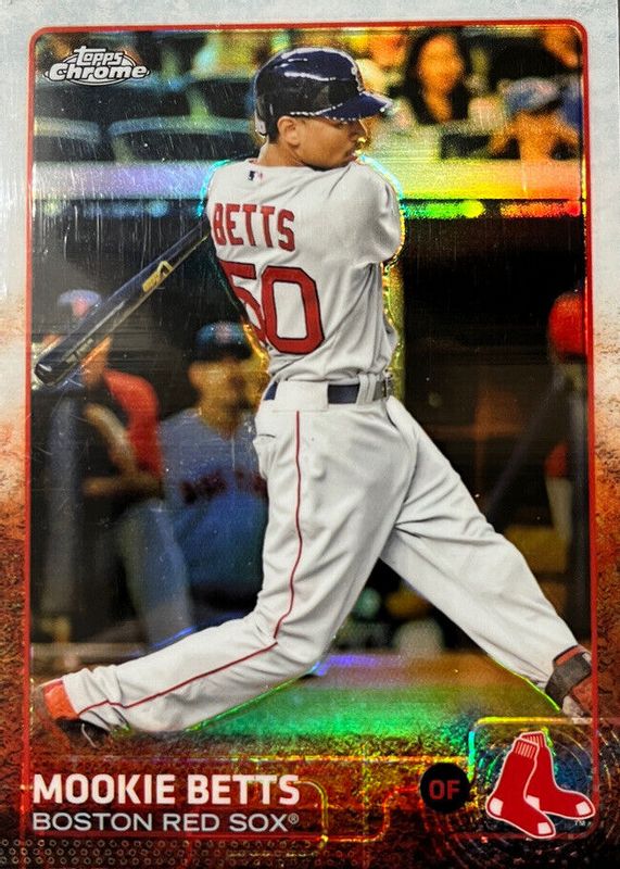 This card is 1 of 11 Mookie Betts' card variations in the 2015 Topps Chrome set being tracked by Sports Card Investor, including Pink Refractor, Prism Refractor, Sepia Refractor, Purple Refractor /250, and Blue Refractor /150.