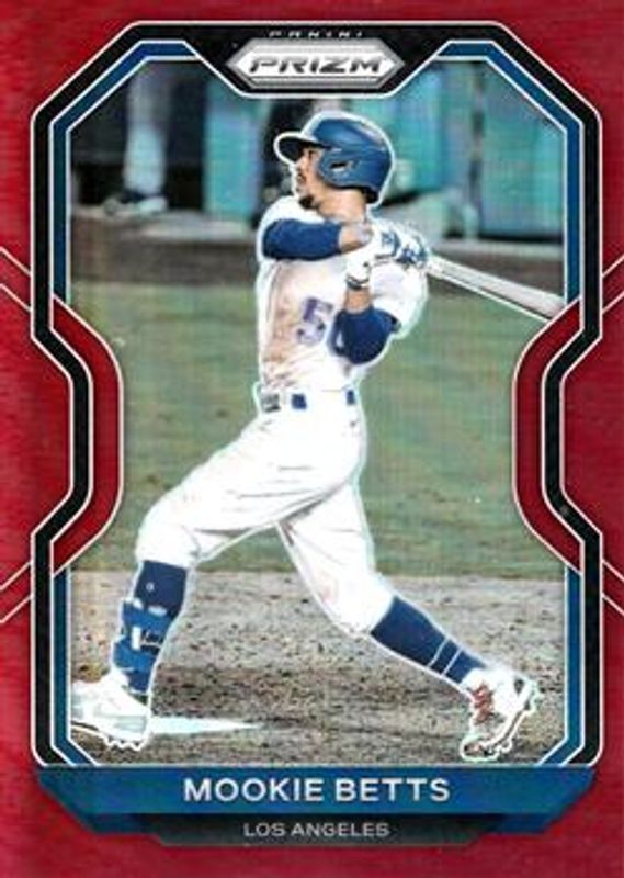 The Mookie Betts 2021 Prizm #244 Red card is 1 of 94 Mookie Betts' card variations in the 2021 Prizm set being tracked by Sports Card Investor, including Base, Blue, Blue Velocity, Carolina Blue, and Cosmic Haze.