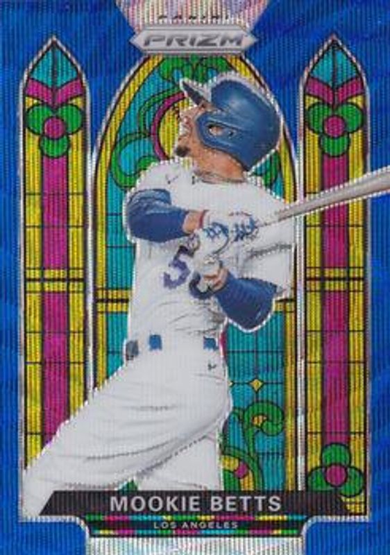 The Mookie Betts 2021 Prizm #SG-2 Stained Glass - Blue Wave /60 card is 1 of 94 Mookie Betts' card variations in the 2021 Prizm set being tracked by Sports Card Investor, including Base, Blue, Blue Velocity, Carolina Blue, and Cosmic Haze.