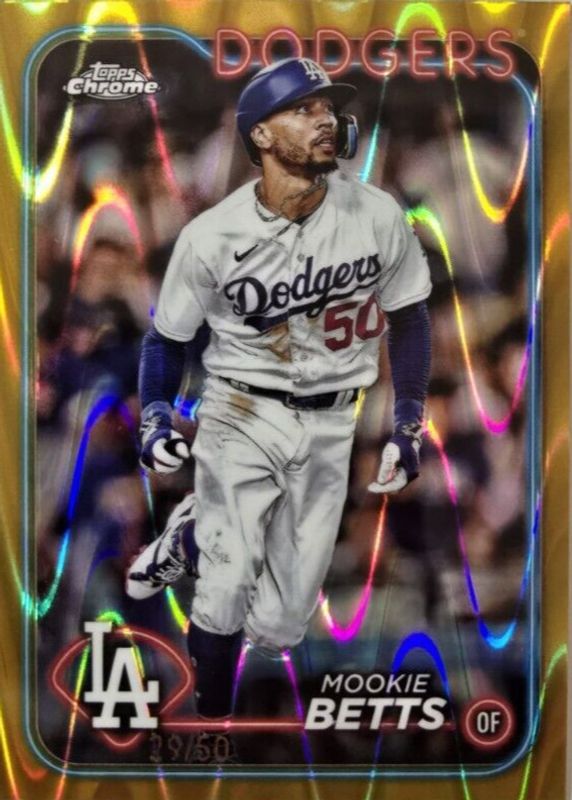 The Mookie Betts 2024 Topps Chrome #296 Gold RayWave Refractor /50 card in Raw condition has not changed in price in the last 30 days and was last sold for $50.00 .