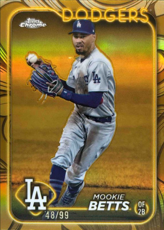 The Mookie Betts 2024 Topps Gilded Collection #50 Base /99 card is 1 of 9 Mookie Betts' card variations in the 2024 Topps Gilded Collection set being tracked by Sports Card Investor, including Gold Wave Refractor /75, Mini-Diamond Refractor /50, Gold RayWave Refractor /25, Gold Lava Refractor /10, and Electroplate Refractor /5.