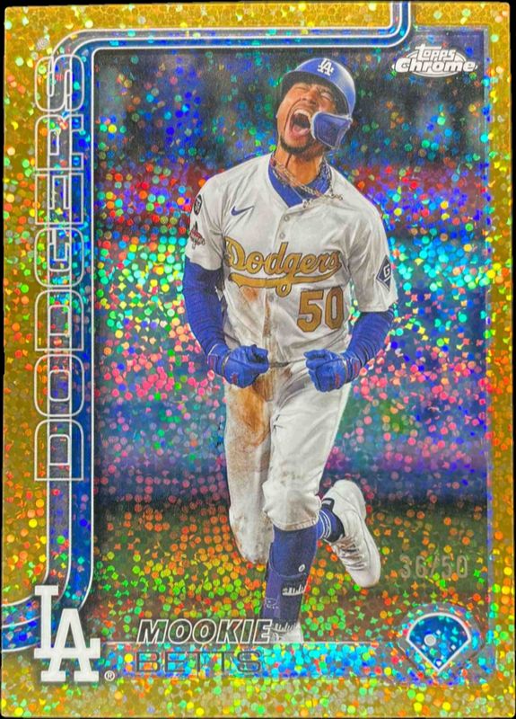 The Mookie Betts 2025 Topps Chrome #50 Base Image Variation - Gold Speckle Refractor /50 card is 1 of 116 Mookie Betts' card variations in the 2025 Topps Chrome set being tracked by Sports Card Investor, including Base, Geometric Refractor, Image Variation, Lightboard Logo Variation, and Negative Refractor.
