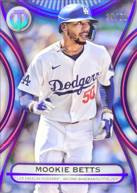 The Mookie Betts 2025 Topps Tribute #80 Purple /50 card is 1 of 20 Mookie Betts' card variations in the 2025 Topps Tribute set being tracked by Sports Card Investor, including Base, Blue /150, Green /99, Gold /75, and Orange /25.