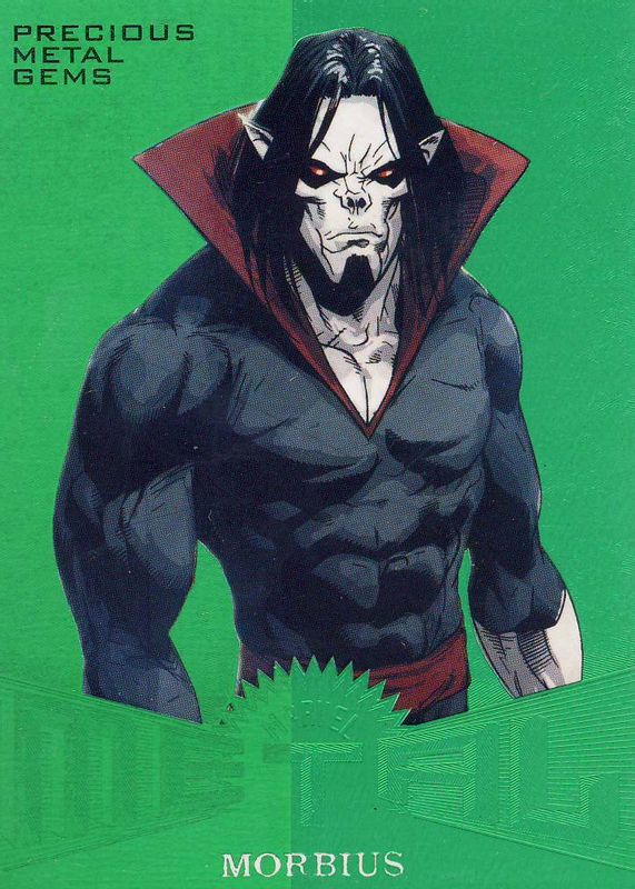 The Morbius 2017 Fleer Ultra Spider-Man #MM28 Precious Metal Gems Green /10 card in Raw condition has not changed in price in the last 30 days and was last sold for $7,499.99 .
