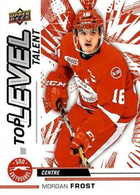 The Morgan Frost 2018 Upper Deck CHL #TL-19 Top Level Talent card is 1 of 9 Morgan Frost's card variations in the 2018 Upper Deck CHL set being tracked by Sports Card Investor, including Base, Silver, Printing Plates Black /1, Printing Plates Cyan /1, and Printing Plates Magenta /1.