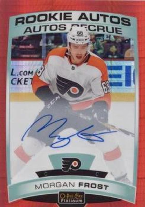 The Morgan Frost 2019 O-Pee-Chee Platinum #R-MF Rookie Autos - Red Prism /50 card is 1 of 23 Morgan Frost's card variations in the 2019 O-Pee-Chee Platinum set being tracked by Sports Card Investor, including Base, Matte Pink, Rainbow, Sunset, and Violet Pixels /399.