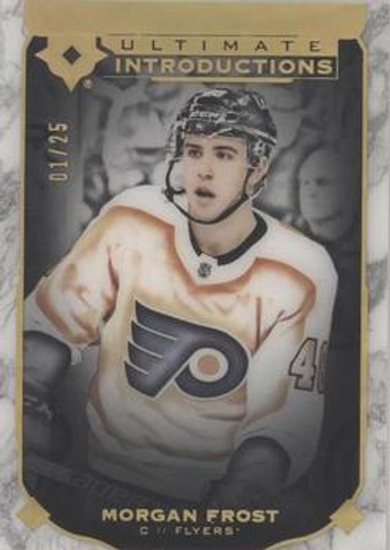 The Morgan Frost 2019 Upper Deck Ultimate Collection #UI-89 Ultimate Introductions - Onyx Black /25 Rookie card is 1 of 6 Morgan Frost's card variations in the 2019 Upper Deck Ultimate Collection set being tracked by Sports Card Investor, including Base /299, Ultimate Introductions, Ultimate Rookies Jersey /399, Ultimate Introductions - Purple /9, and Quest Challenge Achievement VIP Mastery Shield Autographs /1.