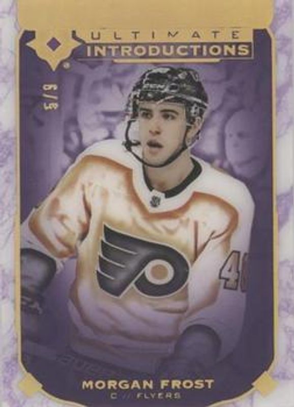 The Morgan Frost 2019 Upper Deck Ultimate Collection #UI-89 Ultimate Introductions - Purple /9 Rookie card is 1 of 6 Morgan Frost's card variations in the 2019 Upper Deck Ultimate Collection set being tracked by Sports Card Investor, including Base /299, Ultimate Introductions, Ultimate Rookies Jersey /399, Ultimate Introductions - Onyx Black /25, and Quest Challenge Achievement VIP Mastery Shield Autographs /1.