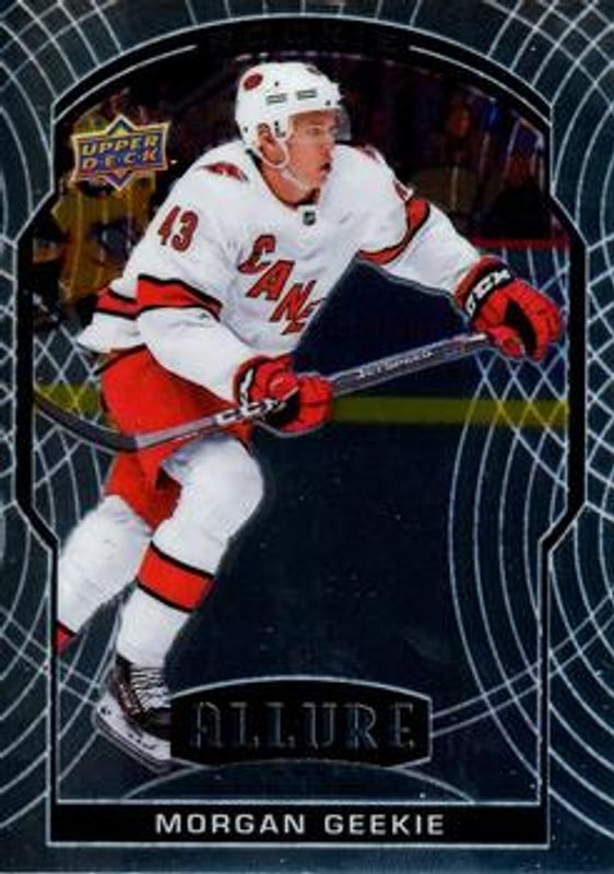 The Morgan Geekie 2020 Upper Deck Allure #74 Base Rookie card is 1 of 57 Morgan Geekie's card variations in the 2020 Upper Deck Allure set being tracked by Sports Card Investor, including Base, 2005 Shield, Black Rainbow, Blue China, and Double Rainbow.