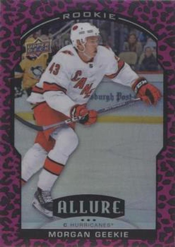 The Morgan Geekie 2020 Upper Deck Allure #74 Pink Leopard Rookie card is 1 of 57 Morgan Geekie's card variations in the 2020 Upper Deck Allure set being tracked by Sports Card Investor, including #74 Base, #119 Base, #74 2005 Shield, #74 Black Rainbow, and #74 Blue China.
