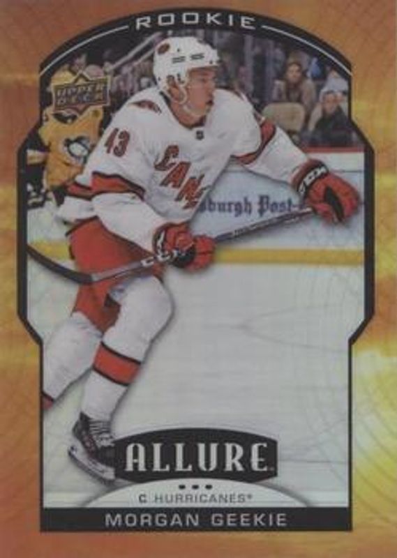 The Morgan Geekie 2020 Upper Deck Allure #74 Sunset Rookie card is 1 of 57 Morgan Geekie's card variations in the 2020 Upper Deck Allure set being tracked by Sports Card Investor, including #74 Base, #119 Base, #74 2005 Shield, #74 Black Rainbow, and #74 Blue China.
