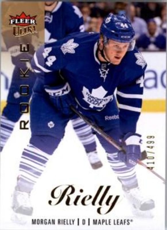 The Morgan Rielly 2013 Fleer Showcase #65 Ultra /499 Rookie card is 1 of 13 Morgan Rielly's card variations in the 2013 Fleer Showcase set being tracked by Sports Card Investor, including Base /175, Metal Universe, Skybox Premium /299, Ultra Red Medallion /99, and Precious Metal Gems Red /75.