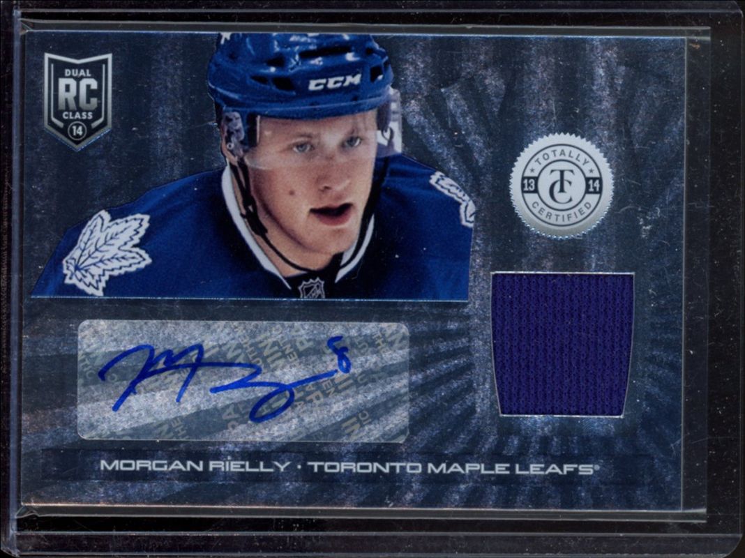 The Morgan Rielly 2013 Totally Certified #246 Rookie Autographs Jersey card is 1 of 35 Morgan Rielly's card variations in the 2013 Totally Certified set being tracked by Sports Card Investor, including Base, Platinum Red /100, Platinum Blue /50, Mirror Platinum Purple /35, and Mirror Platinum Red /25.