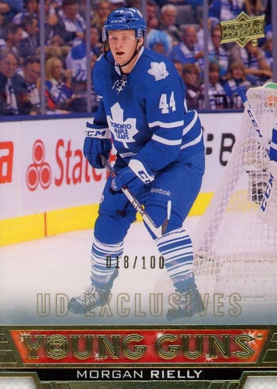 The Morgan Rielly 2013 Upper Deck #218 Young Guns - UD Exclusives /100 Rookie card in Raw condition has not changed in price in the last 30 days and was last sold for $171.69 .