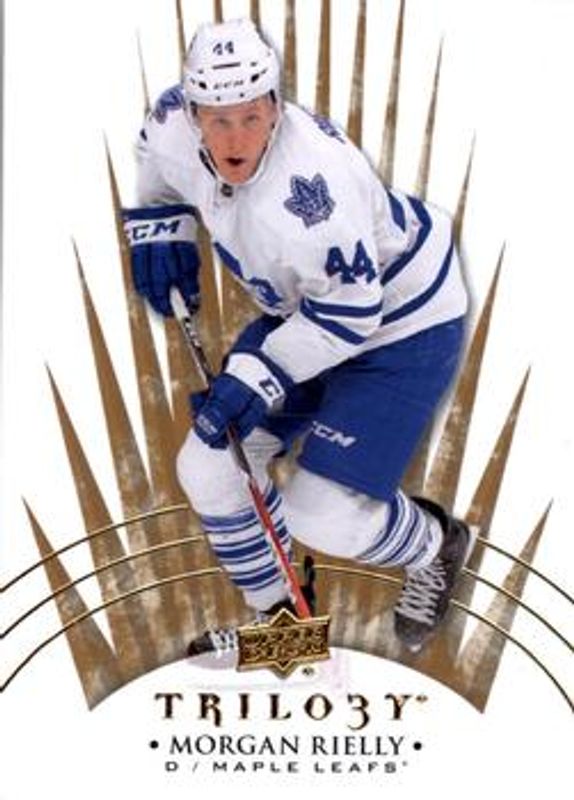The Morgan Rielly 2014 Upper Deck Trilogy #1 Base /799 card is 1 of 8 Morgan Rielly's card variations in the 2014 Upper Deck Trilogy set being tracked by Sports Card Investor, including Radiant Blue /499, Radiant Green /199, Radiant Black /3, Printing Plates Black /1, and Printing Plates Cyan /1.