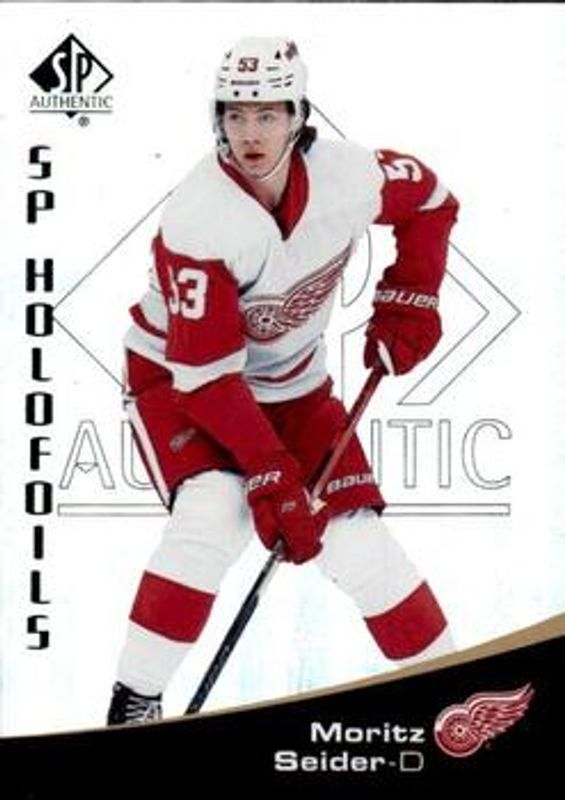 The Moritz Seider 2021 SP Authentic #HF-20 SP Holofoils Rookie card is 1 of 19 Moritz Seider's card variations in the 2021 SP Authentic set being tracked by Sports Card Investor, including Black Autographs, Limited Red, Limited Gold /99, Limited Black /1, and Die Cuts.