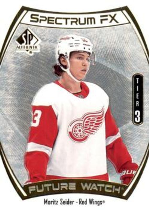 The Moritz Seider 2021 SP Authentic #S-98 Spectrum FX Rookie card is 1 of 19 Moritz Seider's card variations in the 2021 SP Authentic set being tracked by Sports Card Investor, including Black Autographs, Limited Red, Limited Gold /99, Limited Black /1, and Die Cuts.
