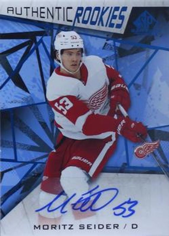 The Moritz Seider 2021 SP Game Used #195 Blue Auto Rookie card is 1 of 30 Moritz Seider's card variations in the 2021 SP Game Used set being tracked by Sports Card Investor, including Base /99, Red Jersey, Red Fragment /205, Gold Auto Jersey /99, and Gold Fragment /25.