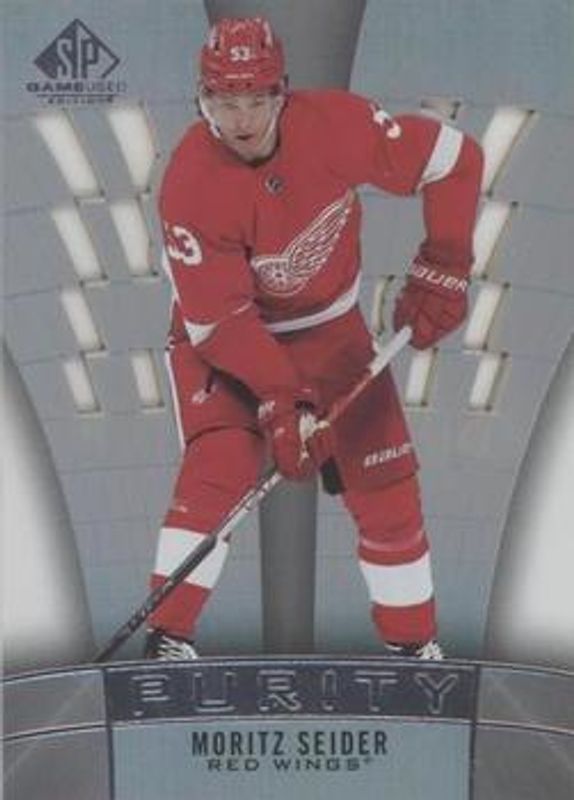 The Moritz Seider 2021 SP Game Used #P-75 Purity Rookie card is 1 of 30 Moritz Seider's card variations in the 2021 SP Game Used set being tracked by Sports Card Investor, including Base /99, Blue Auto, Red Jersey, Red Fragment /205, and Gold Auto Jersey /99.