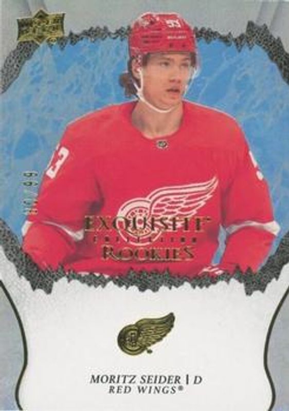 The Moritz Seider 2021 Upper Deck Ice #R-49 Exquisite Collection Rookies - Blue /99 card is 1 of 51 Moritz Seider's card variations in the 2021 Upper Deck Ice set being tracked by Sports Card Investor, including #248 Base /999, #148 Base /999, #148 Ice Blue, #148 Jersey, and #148 Lavender.