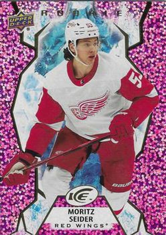 The Moritz Seider 2021 Upper Deck Ice #148 Lavender Rookie card is 1 of 51 Moritz Seider's card variations in the 2021 Upper Deck Ice set being tracked by Sports Card Investor, including #248 Base /999, #148 Base /999, #148 Ice Blue, #148 Jersey, and #148 Orange.