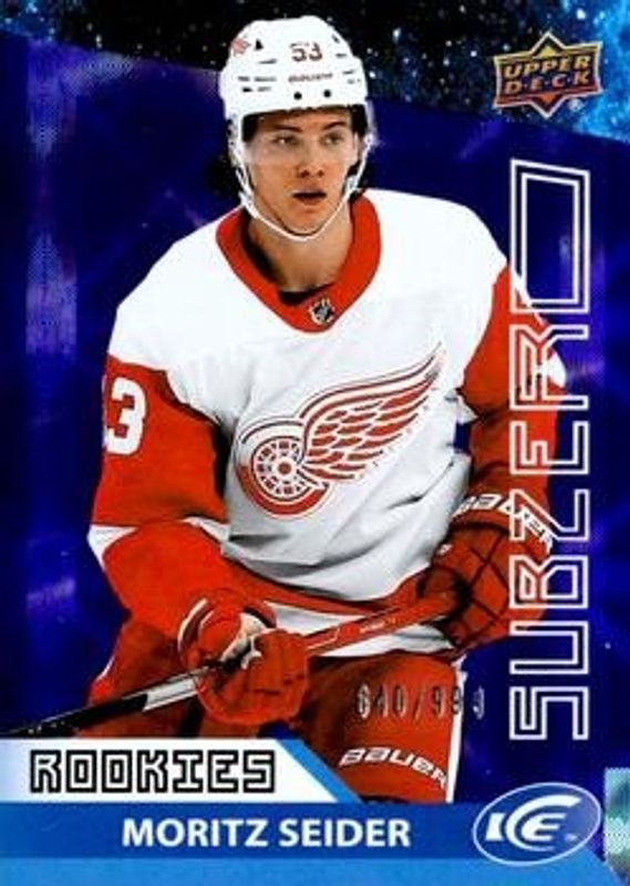 The Moritz Seider 2021 Upper Deck Ice #SZ-58 Sub Zero /999 Rookie card is 1 of 51 Moritz Seider's card variations in the 2021 Upper Deck Ice set being tracked by Sports Card Investor, including #248 Base /999, #148 Base /999, #148 Ice Blue, #148 Jersey, and #148 Lavender.