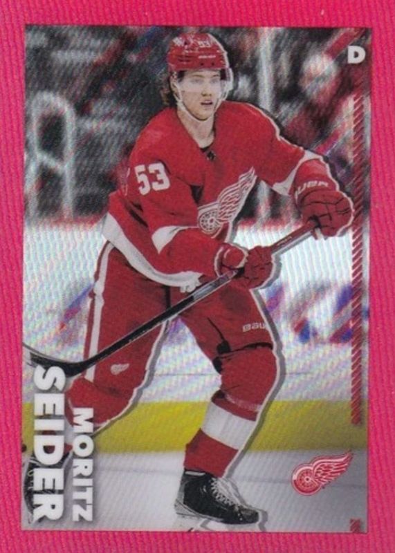 This card is 1 of 7 Moritz Seider's card variations in the 2022 Topps Chrome NHL Sticker Collection set being tracked by Sports Card Investor, including 1971-72 Topps NHL Rookie, Base, Refractor /99, Gold Refractor /50, and Orange Refractor /25.