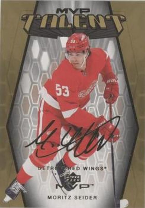 The Moritz Seider 2023 Upper Deck MVP #MT-5 20th Anniversary - Gold Script card is 1 of 20 Moritz Seider's card variations in the 2023 Upper Deck MVP set being tracked by Sports Card Investor, including Base, Gold Script, Ice Battles, Silver Script, and Super Script /25.