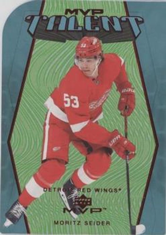 The Moritz Seider 2023 Upper Deck MVP #MT-5 Colors & Contours - Green /20 card is 1 of 20 Moritz Seider's card variations in the 2023 Upper Deck MVP set being tracked by Sports Card Investor, including Base, Gold Script, Ice Battles, Silver Script, and Super Script /25.