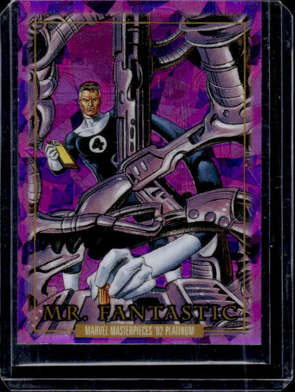 The Mr Fantastic 2024 Upper Deck Marvel Masterpieces '92 Platinum #59 Purple Crystals card is 1 of 38 Mr Fantastic's card variations in the 2024 Upper Deck Marvel Masterpieces '92 Platinum set being tracked by Sports Card Investor, including Base, Blue Traxx, Canvas, Clear Cut, and Emerald Surge.