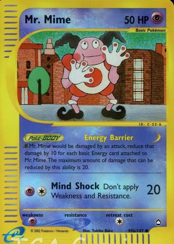 The Mr. Mime 2003 Aquapolis #95b/147 Reverse Holo card in Raw TCG (Near Mint) condition has not changed in price in the last 30 days and was last sold for $39.99 .