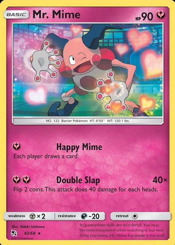 The Mr. Mime 2019 Sun & Moon: Hidden Fates #43/68 Base card in Raw TCG (Near Mint) condition has moved up $2.00 (+66.7%) in the last 30 days and was last sold for $5.00 .