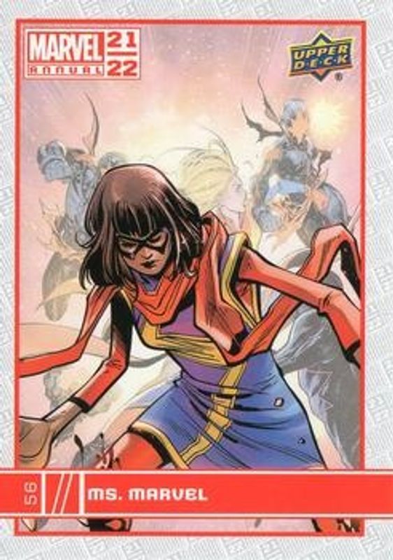 The Ms Marvel 2021 Upper Deck Marvel Annual #56 Base card is 1 of 16 Ms Marvel's card variations in the 2021 Upper Deck Marvel Annual set being tracked by Sports Card Investor, including Blue, Canvas Variant, Green, Magenta, and Red.