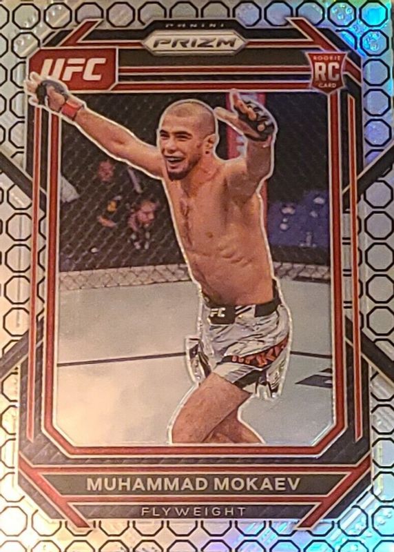 The Muhammad Mokaev 2023 Prizm UFC #124 Octagon /8 Rookie card in Raw condition has not changed in price in the last 30 days and was last sold for $615.00 .